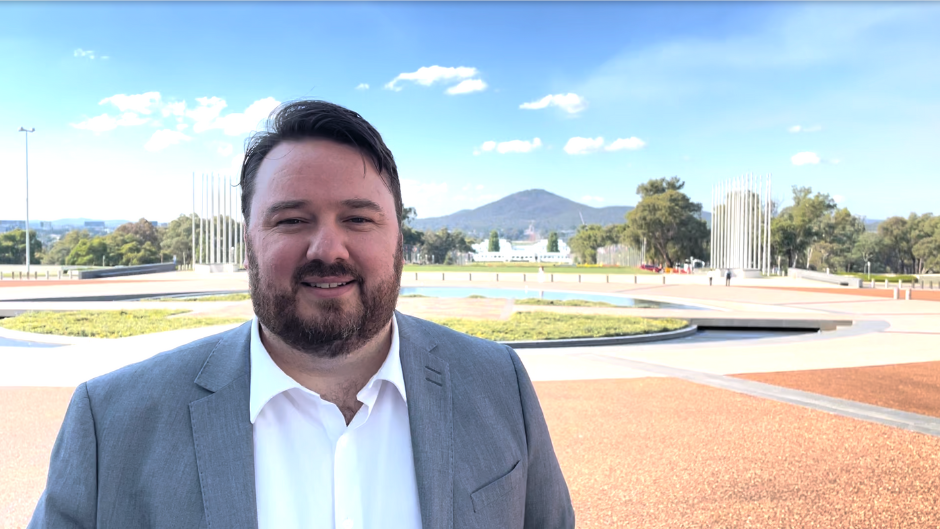 The image features Chris Armstrong, who is in an outdoor setting with a mountainous landscape in the background. He is wearing a suit and standing on a paved area surrounded by greenery and modern structures.